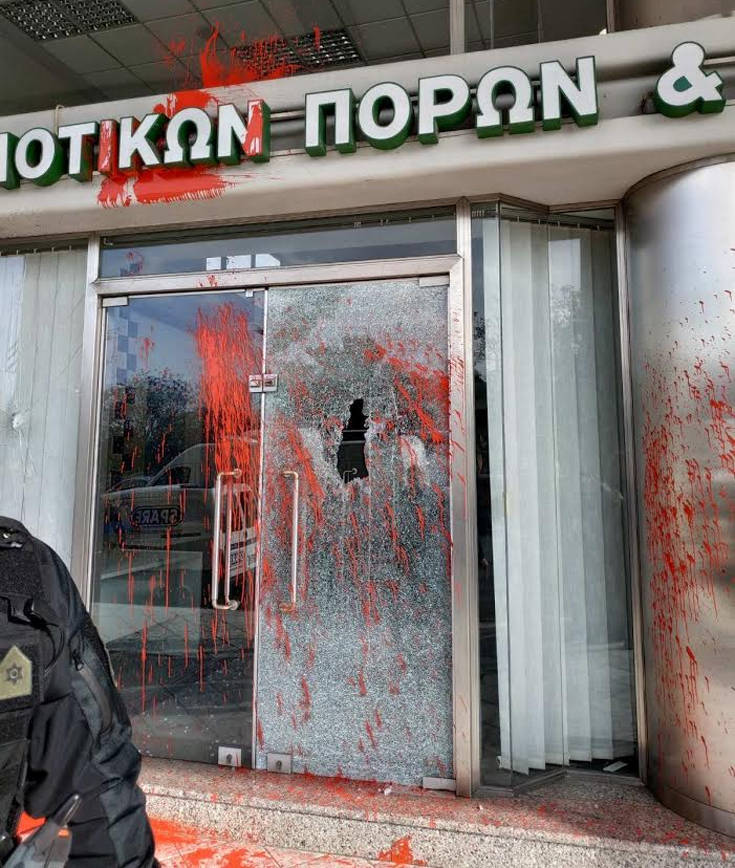 Επίθεση με μπογιές πραγματοποίησε ομάδα ατόμων που βγήκε από τη Γεωπονική σχολή στη γενική γραμματεία Κοινοτικών Πόρων, του υπουργείου Αγροτικής Ανάπτυξης και Τροφίμων που βρίσκονται επί της λεωφόρου Καβάλας 56 – 58.