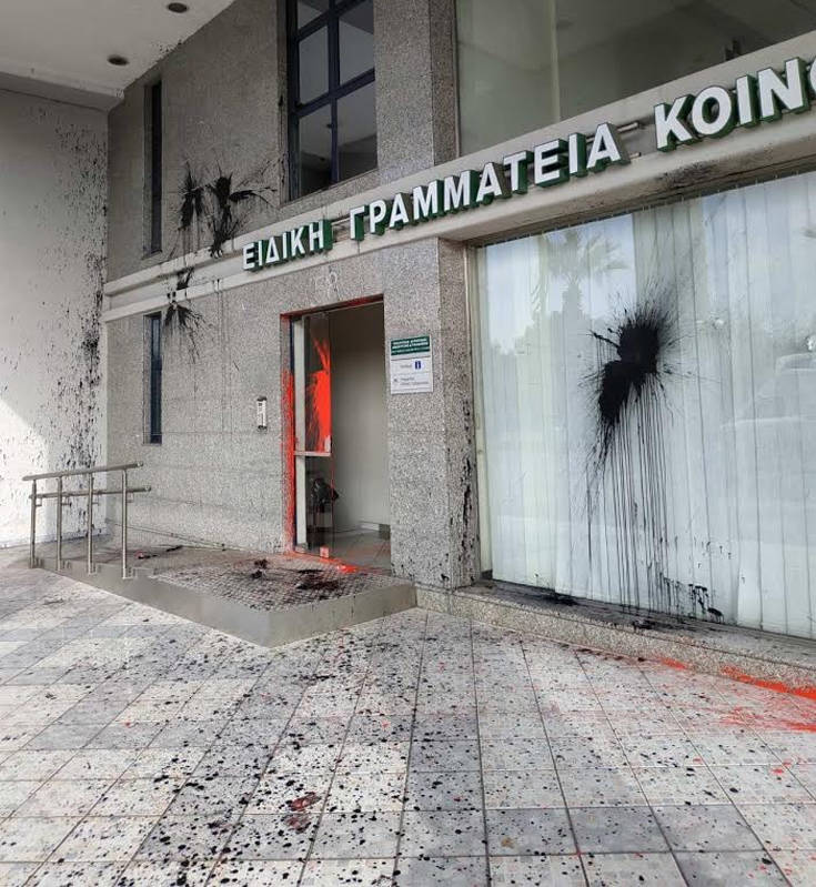 Οι δράστες που είχαν καλυμμένα τα πρόσωπά τους έριξαν μπογιές στο κτίριο όπου στεγάζεται η γενική γραμματεία, ενώ έσπασαν και μια τζαμαρία στην πρόσοψη του κτιρίου. Δεν έχουν γίνει προσαγωγές, σύμφωνα με πληροφορίες από την ΕΛΑΣ.