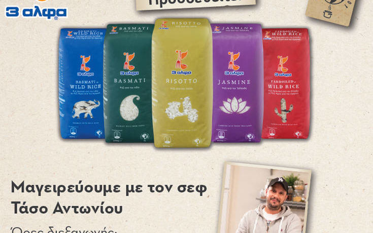 Κάθε συσκευασία ρυζιού 3αλφα από τη σειρά «Γεύσεις του Κόσμου» αποτελεί και μια ξεχωριστή εμπειρία καθώς κρύβει μέσα της την κουλτούρα και τον πολιτισμό ενός ολόκληρου λαού! Tα ρύζια Jasmine, Basmati, Risotto, Parboiled με Wild Rice και Basmati με Wild Rice της 3αλφα, με τις ανανεωμένες συσκευασίες τους, θα «προσγειωθούν» στα καταστήματα ΣΚΛΑΒΕΝΙΤΗΣ και ο Τάσος Αντωνίου θα δημιουργήσει εξωτικές συνταγές από την αντίστοιχη χώρα προέλευσής τους.