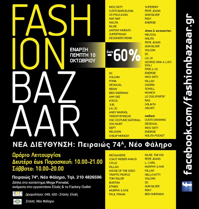 Το καθιερωμένο Fashion Bazaar με τα αγαπημένα σήματα Custo Barcelona, Miss Sixty, Energie, Pepe Jeans, Nolita, Cycle, Scholl, Andy Warhol, Melissa,US Polo ASSN, Superdry,Kocca, Ra.Re Religion, Kocca, Paul Frank, Ben Sherman, Supertrash, Antony Morato, Quiksilver, Roxy, Desigual, Cheap Monday, Reign, Amy Gee- και πολλά άλλα, ανοίγει τις πόρτες του την Πέμπτη 10 Οκτωβρίου!