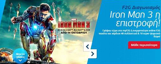Όσοι ενδιαφέρονται να κερδίσουν απίθανα συλλεκτικά δώρα από την ταινία IRON MAN 3, αρκεί να εγγραφούν στο ΜyF2G και να μπουν στη κλήρωση για 5 Marvel’s Iron Man 3D Blu-Ray™, 15 Iron Man 3 DVD και 10 συλλεκτικά ακουστικά. Επιπρόσθετα, όσοι ενεργοποιήσουν online F2G πακέτα μέσα από την σελίδα http://www.wind.gr/gr/f2g/paketa, μπαίνουν στη κλήρωση για 1 Sony Vaio Laptop, 1 Sony Home Cinema, 2 Sony Blu-Ray™players, 3 Sony φορητά DVD players & 3 Sony Docking stations. Ο διαγωνισμός θα διαρκέσει μέχρι τη Τρίτη 15 Οκτωβρίου 2013.