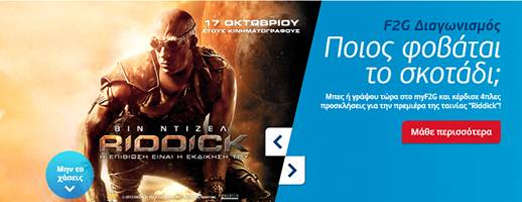 Ειδικότερα, όλοι όσοι δημιουργήσουν προφίλ στο MyF2G ή ανανεώσουν online το πακέτο χρόνου ομιλίας, SMS ή MB τους, λαμβάνουν μέρος στον διαγωνισμό «RIDDICK» προκειμένου να διεκδικήσουν 150 τετραπλές προσκλήσεις για να παρακολουθήσουν πρώτοι απ’ όλους της την ταινία. Ο διαγωνισμός θα ολοκληρωθεί την Δευτέρα 14 Οκτωβρίου 2013 και η ταινία θα προβληθεί την Τρίτη 15 Οκτωβρίου 2013 στον κινηματογράφο Αθήναιον.