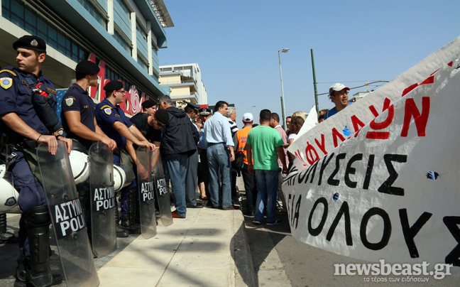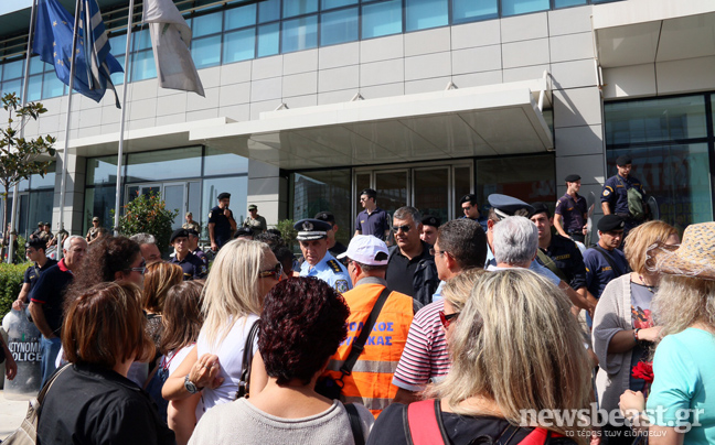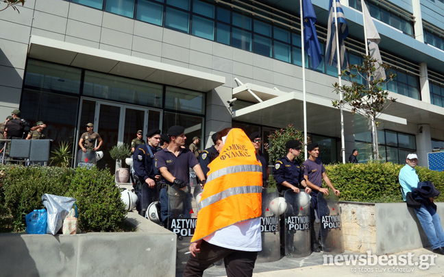Οι σχολικοί φύλακες είχαν συγκεντρωθεί από νωρίς το πρωί έξω από το υπουργείο εκφράζοντας την αντίθεσή τους στο μέτρο της διαθεσιμότητας.