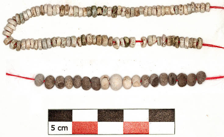 Επίσης, ομοιώματα τρίτωνος και ναυτίλου από φαγεντιανή, μία ψήφος από ορεία κρύσταλλο σε σχήμα οκτώσχημης ασπίδας, με κατάλοιπα ερυθρού νήματος στην οπή ανάρτησης. Τα ανωτέρω αντικείμενα βρέθηκαν κάτω από το αποτύπωμα ξύλινης κατασκευής, και ενδέχεται να ήσαν αναρτημένα σ’ αυτήν. Στις επιχώσεις, τέλος των θυραίων ανοιγμάτων του Χώρου 1 βρέθηκαν ρόδακες , πιθανώς επιθήματα σε ξύλινα στοιχεία. Ιδιαίτερα εμβληματικό είναι το ενεπίγραφο θραύσμα ομοιώματος τρίτωνα. Η επιγραφή, αποτελούμενη από συλλαβογράμματα της Γραμμικής Α γραφής και ένα ιδεόγραμμα, είναι γραμμένη με μελάνι και πιθανολογείται ότι σχετίζεται με την χρήση του κτιρίου.