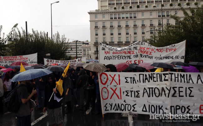 Παρά τη βροχή, περίπου 500 άτομα βρίσκονται στο δρόμο διαμαρτυρόμενα για την κατάσταση που επικρατεί στα πανεπιστήμια.