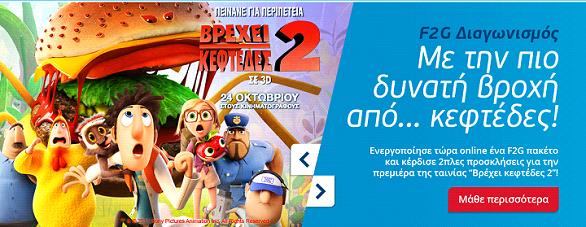 Το WIND F2G στέλνει σινεμά τους φίλους του με όλη την παρέα τους για να παρακολουθήσουν τη νέα ταινία «Βρέχει κεφτέδες 2». Μία απολαυστική κωμωδία κινουμένων σχεδίων με έξυπνο χιούμορ και πρωτόγνωρες καταστάσεις με πολύ φαί!