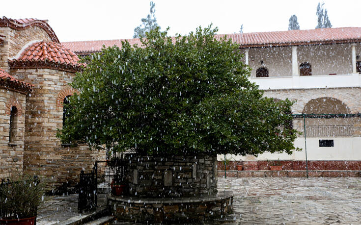 Εικόνες από την χιονόπτωση στη Μονή Πεντέλης…