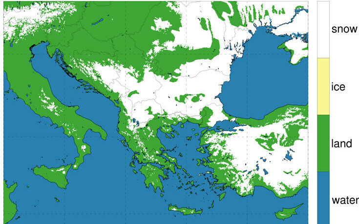 Εικόνα 2. Δορυφορική εκτίμηση της χιονοκάλυψης στη Νοτιοανατολική Ευρώπη και τη Μικρά Ασία στις 8 Φεβρουαρίου 2020
