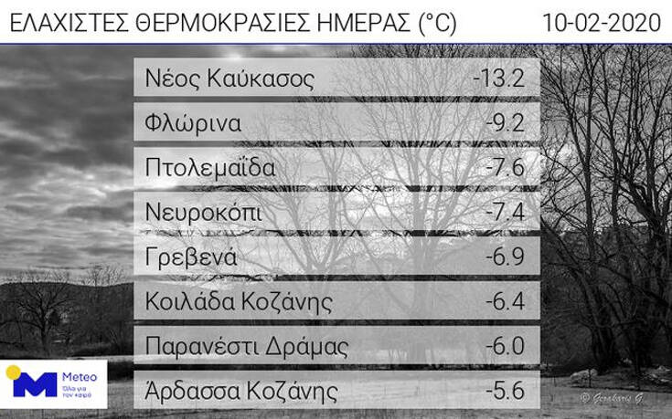 Τη νύχτα της Κυριακής προς Δευτέρα η ελάχιστη θερμοκρασία καταγράφηκε στο Νέο Καύκασο Φλώρινας (-13.2 βαθμοί Κελσίου). Στον πίνακα που ακολουθεί φαίνονται οι 8 σταθμοί του δικτύου αυτόματων μετεωρολογικών σταθμών του Εθνικού Αστεροσκοπείου Αθηνών / meteo.gr που κατέγραψαν τις χαμηλότερες θερμοκρασίες.