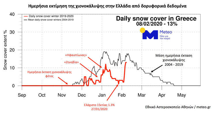 Το γράφημα της Εικόνας 1 του meteo.gr που παρουσιάζει το ποσοστό της χώρας μας καλυμμένο από χιόνι (κόκκινη καμπύλη), δείχνει ότι η χιονοκάλυψη επανήλθε κοντά στον μέσο όρο της τελευταίας 15ετίας μετά το ακραίο ελάχιστο στις 27 Ιανουαρίου. Πρέπει να τονιστεί όμως ότι παρότι η χιονοκάλυψη αυξήθηκε, οι ποσότητες χιονιού δεν ήταν αξιόλογες στις περισσότερες περιοχές που δέχθηκαν φρέσκο χιόνι, επομένως τις επόμενες ημέρες αναμένουμε και πάλι περιορισμένη χιονοκάλυψη για την εποχή. Αντίθετα, πολύ μεγάλα ύψη χιονιού σημειώθηκαν στις χώρες περιμετρικά της Μαύρης Θάλασσας, με το χιόνι να ξεπερνά σε ύψος το 1 μέτρο ακόμη και σε παραθαλάσσιες περιοχές (Εικόνα 2).