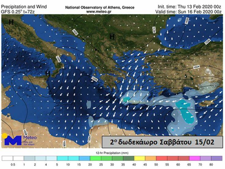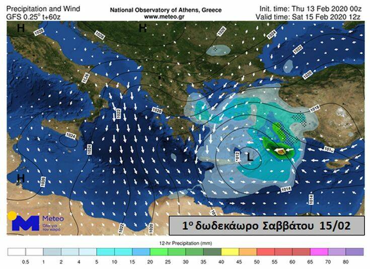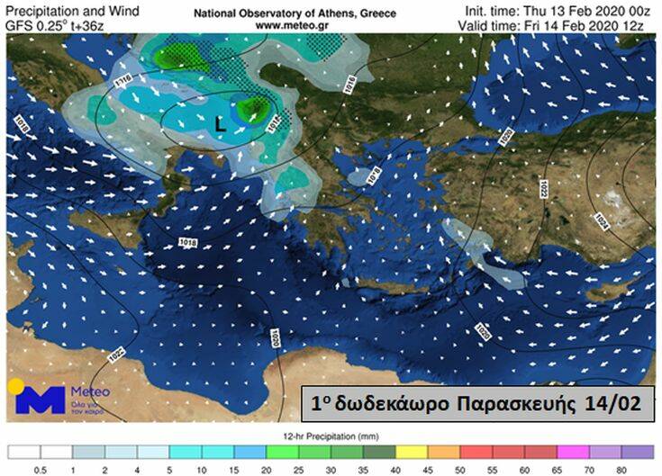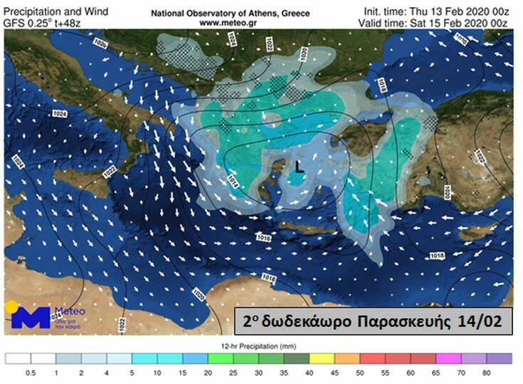 Στους χάρτες που ακολουθούν φαίνεται η κίνηση του χαμηλού, ο υετός και η ταχύτητα και διεύθυνση του ανέμου κατά το διήμερο Παρασκευή 14/02 – Σάββατο 15/02.