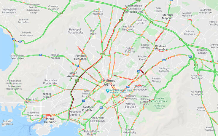Στο κόκκινο είναι η κίνηση στον Κηφισό, στο ύψος των ΚΤΕΛ, στο ρεύμα προς Λαμία, εξαιτίας τροχαίου ατυχήματος που σημειώθηκε πριν από λίγη ώρα.