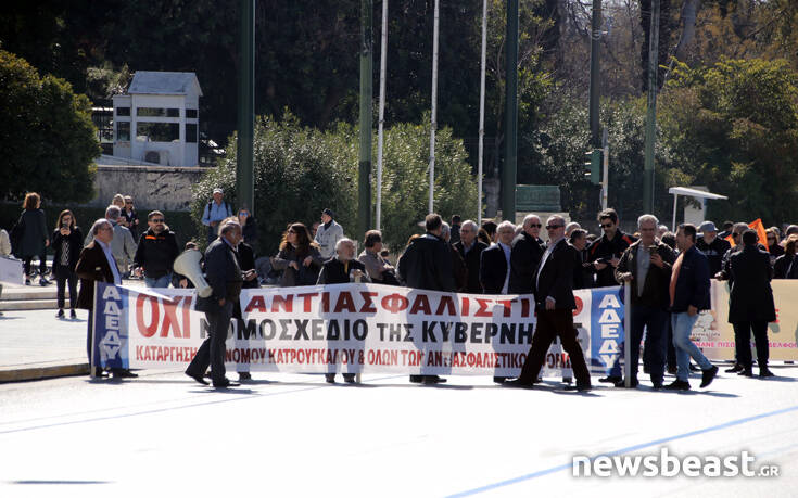 Η απεργιακή συγκέντρωση της ΑΔΕΔΥ, καθώς και άλλων εργατικών σωματείων και ομοσπονδιών, ξεκίνησε από την πλατεία Κλαυθμώνος, ενάντια στο νομοσχέδιο για το ασφαλιστικό, το οποίο κατατέθηκε χθες στη Βουλή από το υπουργείο Εργασίας και Κοινωνικών Υποθέσεων.