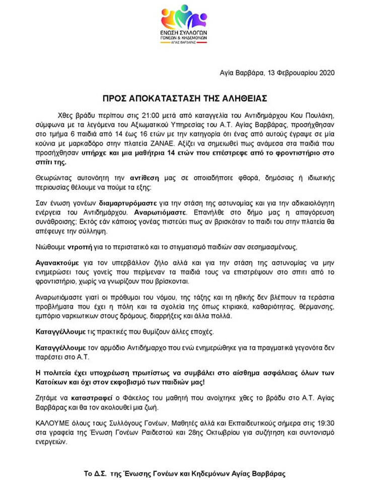 Η Ένωση Γονέων Αγίας Βαρβάρας πραγματοποίησε συνάντηση για το συντονισμό των περαιτέρω ενεργειών της σχετικά με το θέμα.