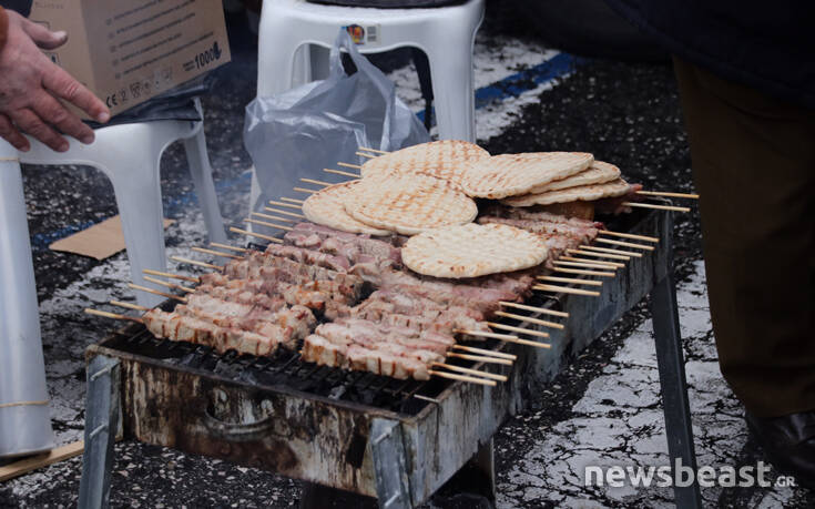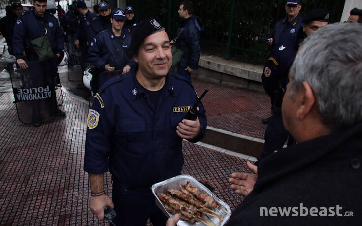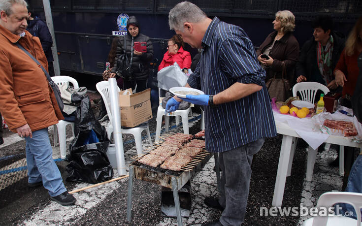 Σε μια κίνηση καλής θέλησης, ένεκα της Τσικνοπέμπτης, προχώρησαν τα μέλη της ΠΟΕΔΗΝ που διαμαρτύρονται με ψησταριές μπροστά από τις κλούβες των ΜΑΤ στην Ηρώδου Αττικού.