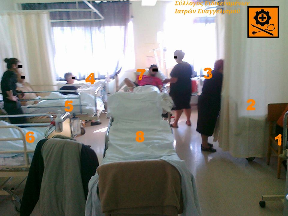 Οκτώ σε κάθε θάλαμο. Συν 1-2 επισκέπτες ανά ασθενή, με τις ξαπλώστρες «παραλίας» (για να ξεκουραστούν κάπου τα βράδια). Σα να σκουπίζεις της σκόνη κάτω από το χαλί. Μετά συζητάμε με επιστημονικό ύφος για τις ενδονοσοκομειακές λοιμώξεις που ανθίζουν στην Ελλάδα…»