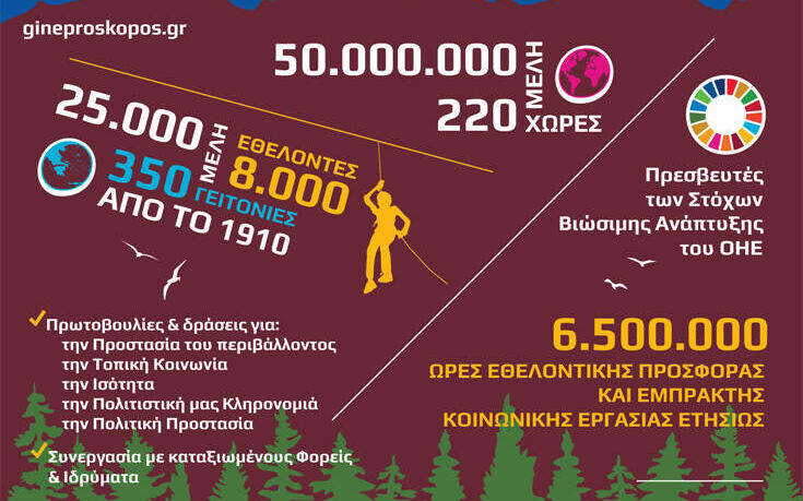 Στην Ελλάδα εδώ και 110 χρόνια, η Προσκοπική Κίνηση αποτελεί τη μεγαλύτερη και μακροβιότερη εθελοντική κίνηση για νέους με 25000 μέλη σε 350 γειτονιές. Περισσότεροι από 8.000 ενήλικοι εθελοντές με εργαλείο το ομαδικό παιχνίδι και τις βιωματικές δραστηριότητες στη φύση βοηθούν τα παιδιά και τους εφήβους να ανακαλύψουν ικανότητες και να αναπτύξουν δεξιότητες που θα τους είναι χρήσιμες για το υπόλοιπο της ενήλικης ζωής τους.