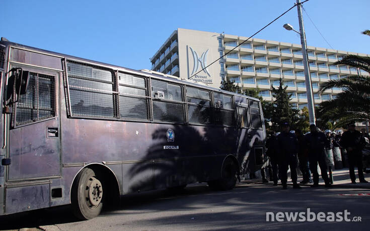 Οι δρόμοι γύρω από το ξενοδοχείο είναι αποκλεισμένοι από πολύ νωρίς ενώ, σύμφωνα με το ρεπορτάζ, σύνεδροι κλήθηκαν να δώσουν τα στοιχεία τους και στην Αστυνομία για να περάσουν.