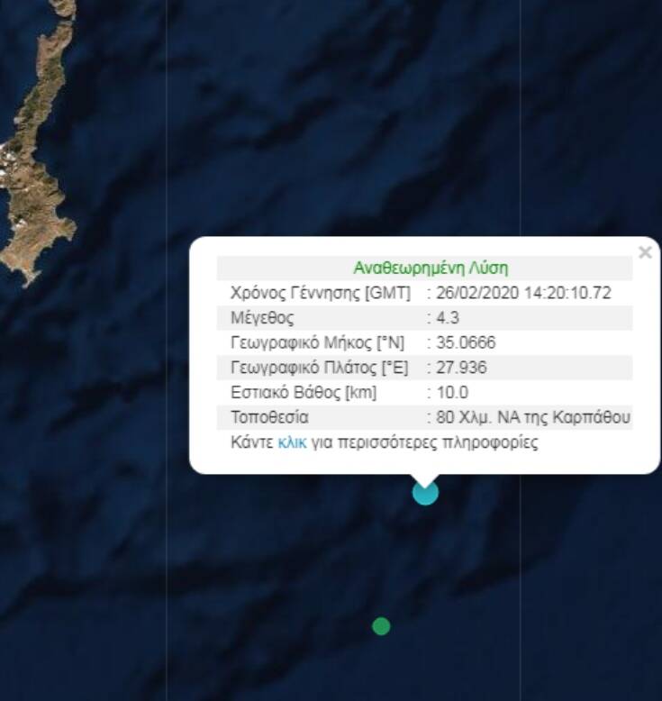 Σύμφωνα με την ανακοίνωση, το επίκεντρο της δόνησης εντοπίζεται στο θαλάσσιο χώρο 81 Χλμ. ΝΑ της Καρπάθου ή 497 Χλμ. ΝΑ της Αθήνας.
