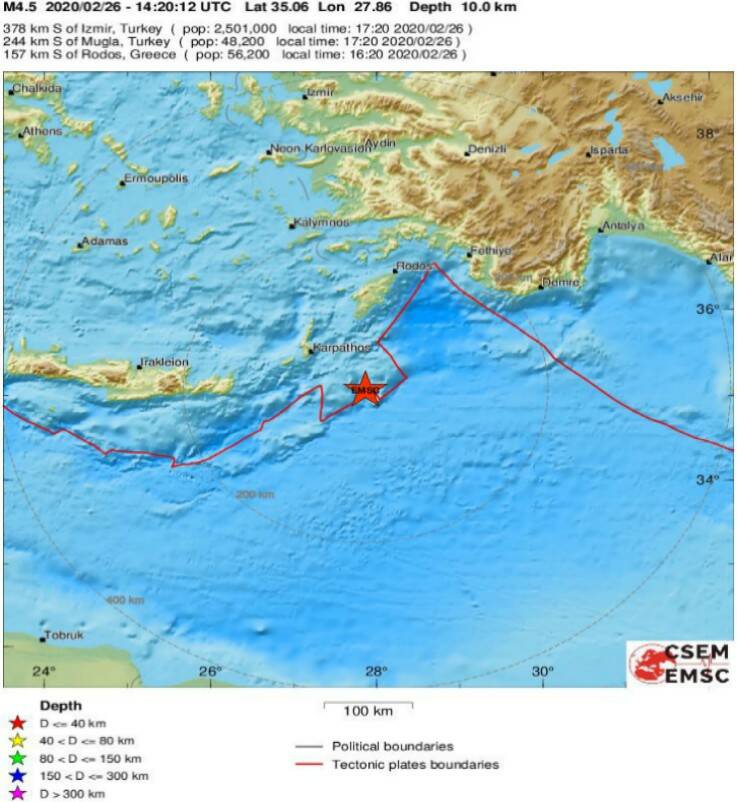 Σεισμική δόνηση, με μέγεθος 4,3 βαθμών της κλίμακας Ρίχτερ, ΝΑ της Καρπάθου κατέγραψαν οι σεισμογράφοι σήμερα στις 16:20 , ανακοίνωσε το Γεωδυναμικό Ινστιτούτο του Εθνικού Αστεροσκοπείου Αθηνών εκ μέρους των τεσσάρων φορέων συγκρότησης του Εθνικού Σεισμολογικού Δικτύου.