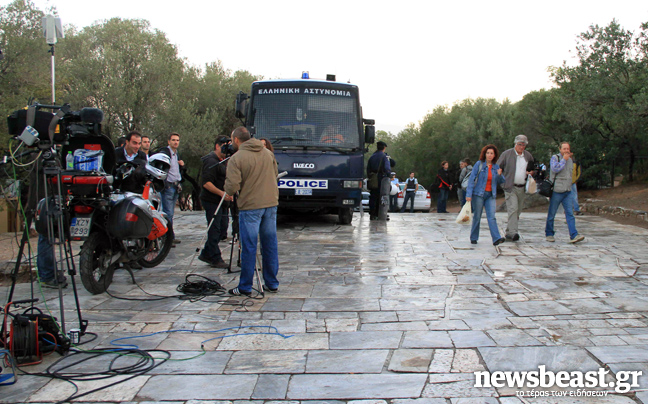 Πριν λίγο δύο ξένοι τουρίστες επιχείρησαν να μπουν στον αρχαιολογικό χώρο και οι αστυνομικοί έκαναν στην άκρη για να τους επιτρέψουν την είσοδο.