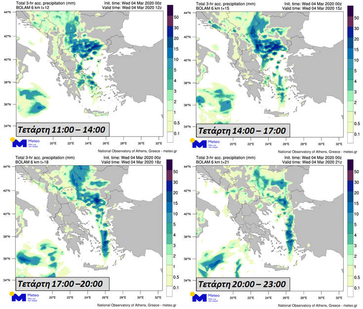 Βροχές και καταιγίδες θα σημειωθούν σήμερα στα κεντρικά και ανατολικά ηπειρωτικά και στο Αιγαίο έως το μεσημέρι της Τετάρτης 04/03, σύμφωνα με τα τελευταία προγνωστικά δεδομένα του Εθνικού Αστεροσκοπείου Αθηνών / meteo.gr.