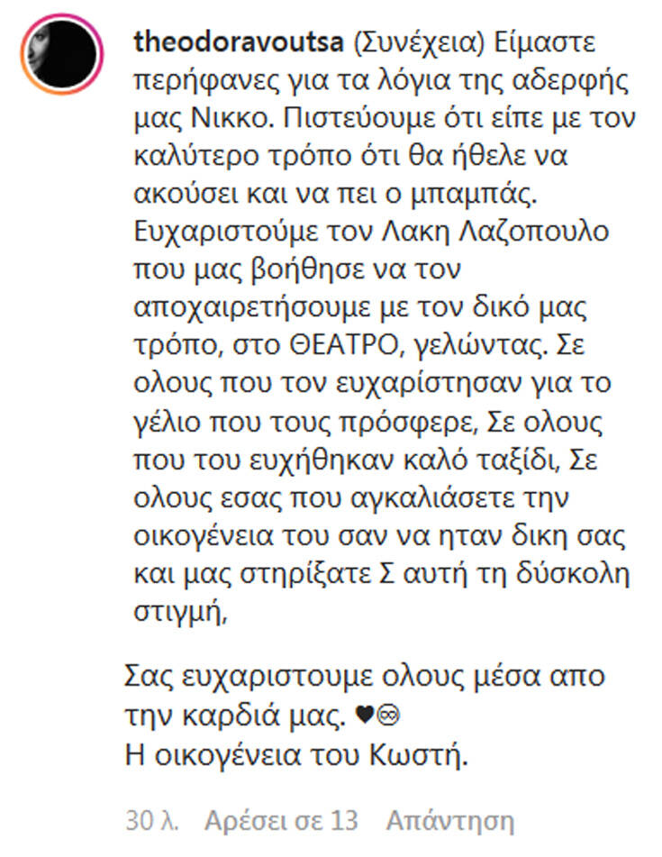 «Είναι πολύ μεγάλη η αγάπη που λαμβάνουμε από όλους για τον μπαμπά, για τον Κώστα, τον Κωστή. Σας ευχαριστούμε πολύ! Ευχαριστούμε τους φίλους, τους συνεργάτες, τους θαυμαστές που ήρθαν στην κηδεία, εκείνους που έστειλαν στεφάνια, που έστειλαν μηνύματα, που ήταν εκεί για τον μπαμπά με όποιο τρόπο μπορούσαν. Λάβαμε τόσα μηνύματα από όλα τα σημεία της γης όπου υπάρχουν Έλληνες. Αισθανθήκαμε την αγάπη όλων!