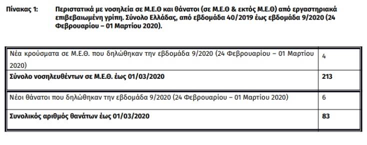 Από την εβδομάδα 40/2019 έως και την εβδομάδα 9/2020 στην Ελλάδα έχουν καταγραφεί 83 θάνατοι από εργαστηριακά επιβεβαιωμένη γρίπη, εκ των οποίων οι 65 αφορούν σε κρούσματα που χρειάστηκαν νοσηλεία στη Μ.Ε.Θ και 18 σε κρούσματα που δεν νοσηλεύτηκαν σε Μ.Ε.Θ.