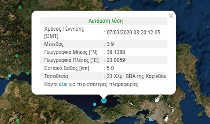 Ο σεισμός ήταν μεγέθους 3,9 Ρίχτερ και το επίκεντρό του ήταν 23 χλμ. βόρεια – βορειοανατολικά της Κορίνθου, έχοντας εστιακό βάθος υπολογίζεται στα 5 χλμ.