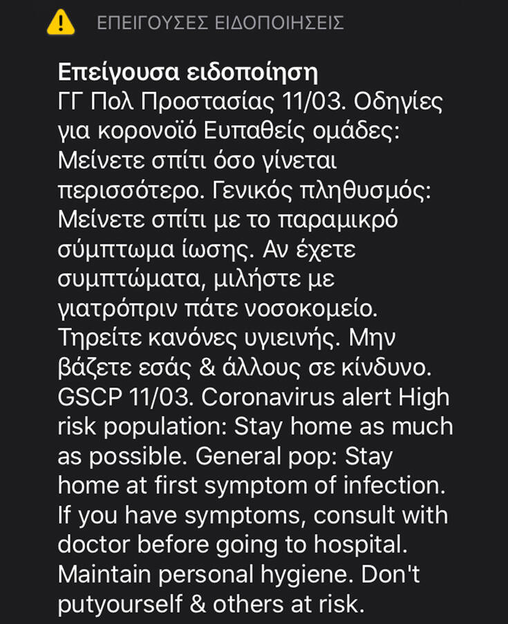 Έκτακτο μήνυμα έστειλε η Γενική Γραμματεία Πολιτικής Προστασίας για τον κορονοϊό πριν από λίγα λεπτά. Η προειδοποίηση στάλθηε