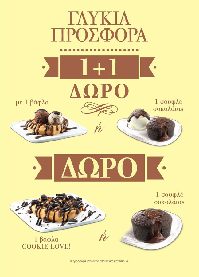 Η πρώτη προσφορά αφορά στη βάφλα και στο σουφλέ σοκολάτας. Συγκεκριμένα, στους καταναλωτές που παραγγέλνουν, κατά την επίσκεψη τους στα καταστήματα δωδώνη, σουφλέ σοκολάτας με ή χωρίς παγωτό, είτε οποιαδήποτε από τις βάφλες του καταλόγου (με minimum την Cookie Love), θα παρέχεται επιπλέον δώρο η βάφλα «Cookie Love» ή ένα επιπλέον σουφλέ σοκολάτας (σκέτο).