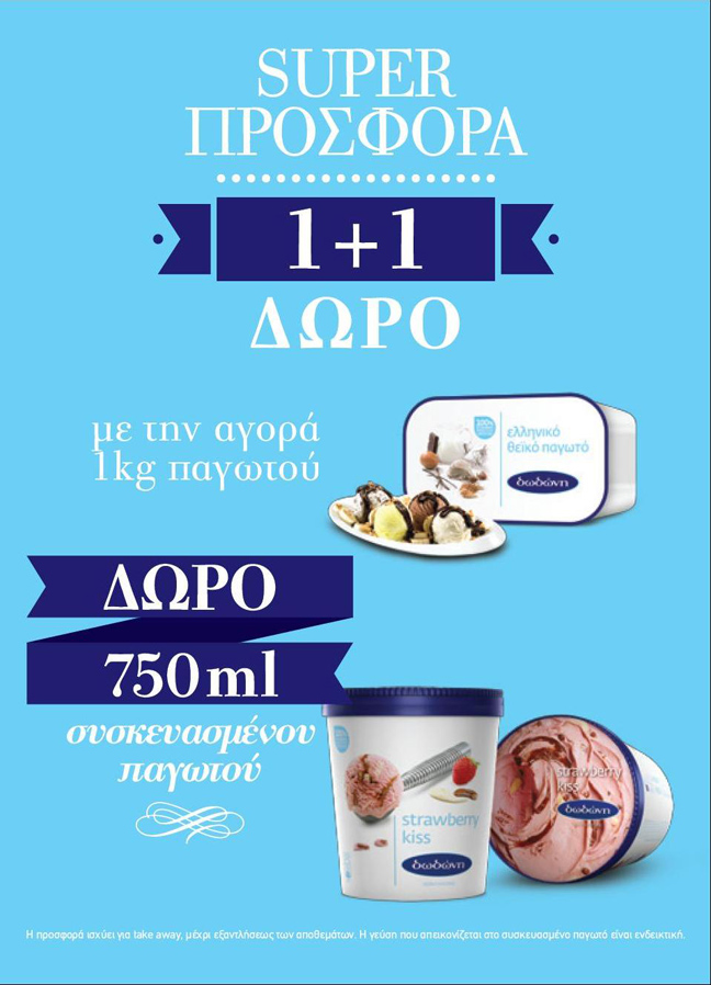 H δεύτερη προσφορά αφορά στο παγωτό, καθώς με αγορά 1 κιλού χύμα παγωτού οποιασδήποτε γεύσης «δωδώνη», οι καταναλωτές θα κερδίζουν επιπλέον δώρο 750ml συσκευασμένου παγωτού.