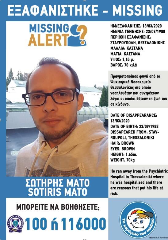 Ο Σωτήρης Μάτο πραγματοποίησε στις 13.03.2020, μεσημβρινές ώρες, φυγή από το Ψυχιατρικό Νοσοκομείο Θεσσαλονίκης στο οποίο νοσηλευόταν και συντρέχουν λόγοι οι οποίοι θέτουν τη ζωή του σε κίνδυνο.