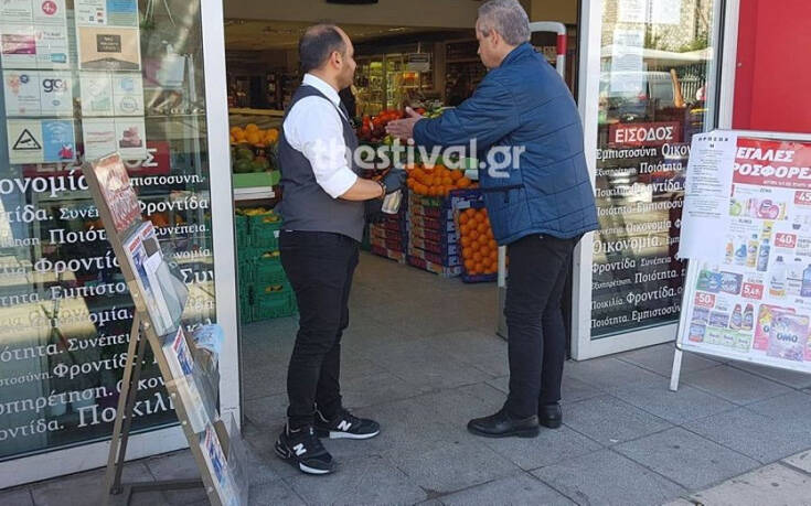 Στην είσοδο των καταστημάτων υπάρχει υπεύθυνος που ενημερώνει τον κόσμο να τηρεί τις αποστάσεις, ενώ δίνει αντισηπτικό σε όσους δεν φοράνε γάντια.