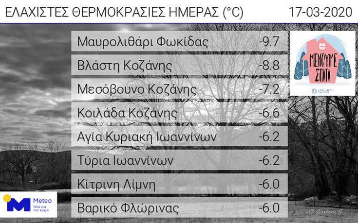 Ακολούθησαν Βλάστη Κοζάνης (-9,7), Μεσόβουνο Κοζάνης (-7,2), Κοιλάδα Κοζάνης (-6,6) και Αγία Κυριακή Ιωαννίνων (-6,2), σύμφωνα με τα στοιχεία του δικτύου των αυτόματων μετεωρολογικών σταθμών του Εθνικού Αστεροσκοπείου Αθηνών/meteo.gr.