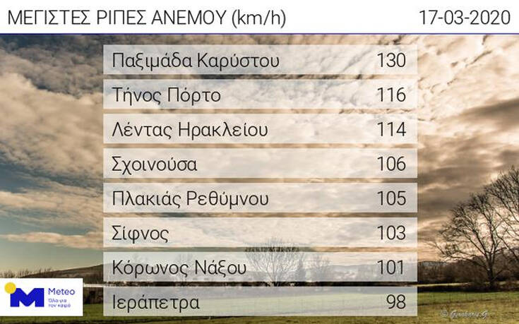 Χαρακτηριστικότερο είναι το παράδειγμα της Παξιμάδας Καρύστου όπου καταγράφηκε ριπή 130 χλμ/ώρα, ενώ ακολούθησαν Πόρτο Τήνου (130 χλμ.ώρα), Λέντας Ηρακλείου (114 χλμ/ώρα), Σχοινούσα (106 χλμ/ ώρα), Πλακιάς Ρεθύμνου (105 χλμ/ώρα) και Σίφνος (103 χλμ/ώρα).