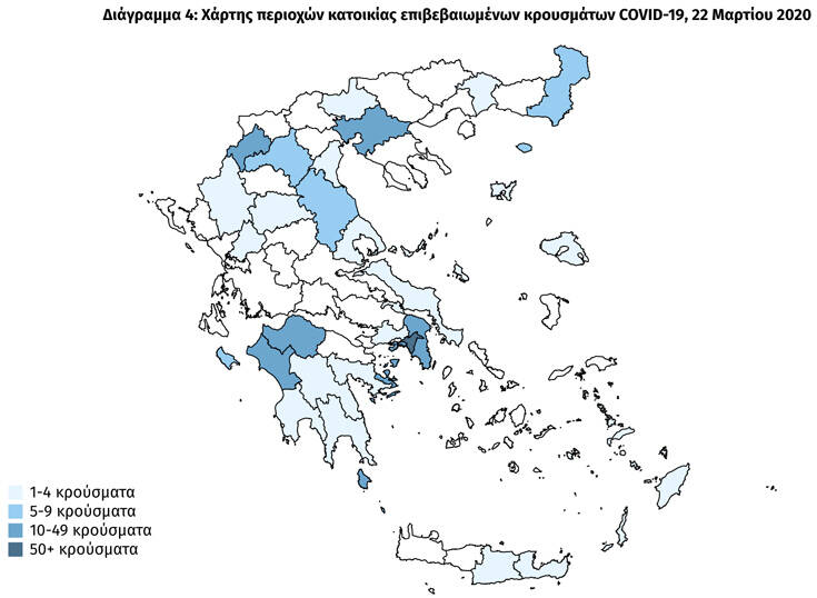 Από την έκθεση που «ανέβηκε» την Κυριακή 22 Μαρτίου προκύπτει ότι μέχρι στιγμής, 28 από τις 74 περιφερειακές ενότητες της χώρας υπάρχουν, πλέον, επιβεβαιωμένα κρούσματα κορονοϊού.