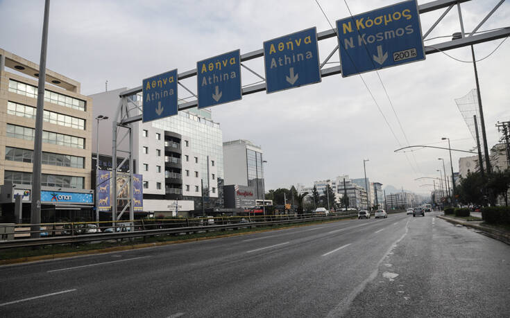 Ελάχιστη είναι η κίνηση των οχημάτων σήμερα, Δευτέρα στη λεωφόρο Συγγρού μετά την ισχύ του νέου μέτρου για την απαγόρευση κυκλοφορίας των πολιτών με στόχο τον περιορισμό της εξάπλωσης του κορονοϊού στη χώρα μας.
