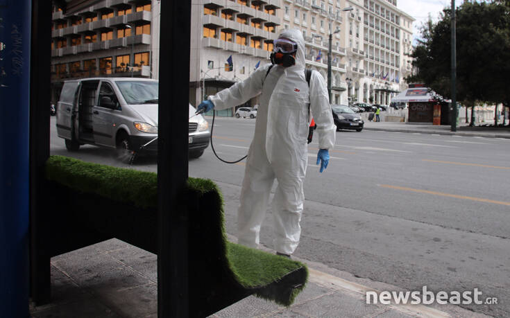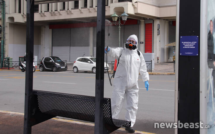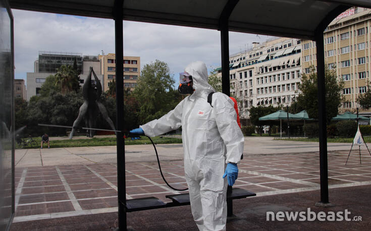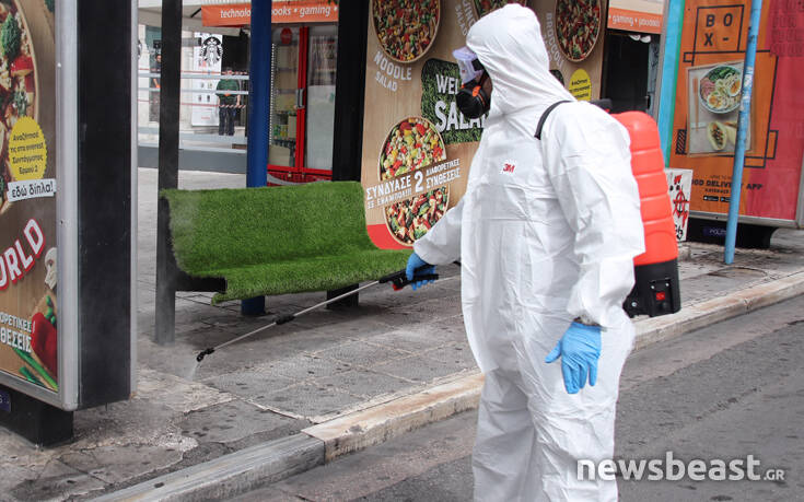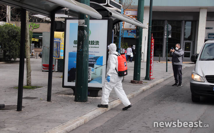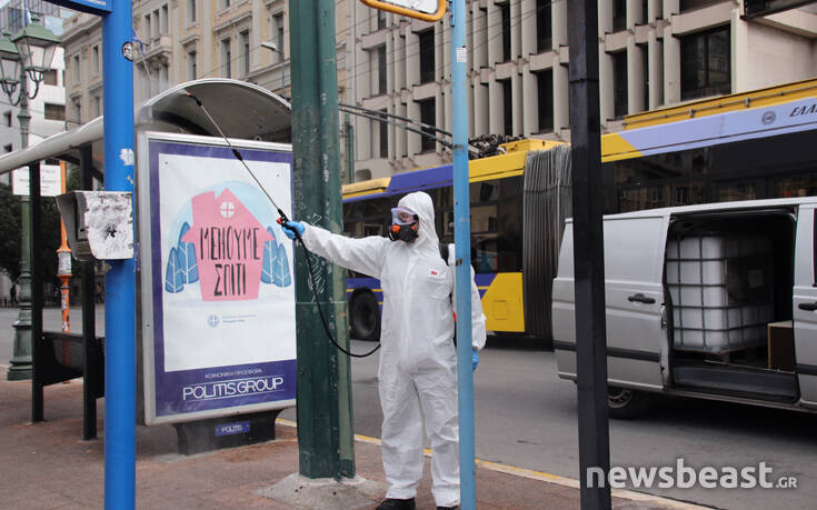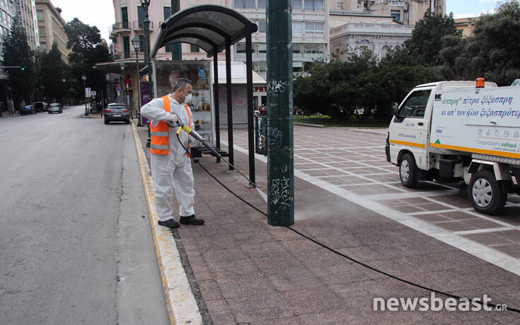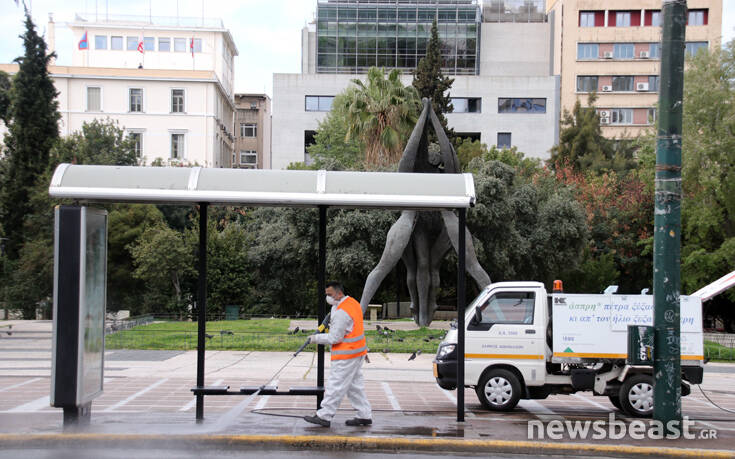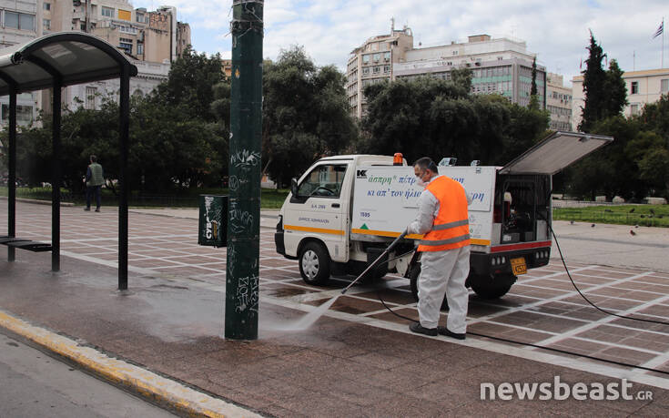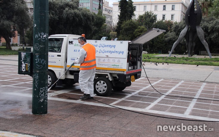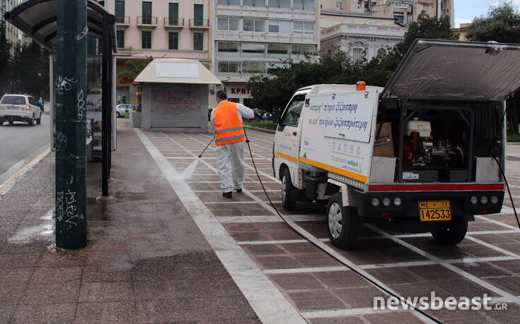 Ειδικό όχημα του δήμου και εργαζόμενος στην καθαριότητα με ειδική στολή, μάσκα και γάντια ήταν από νωρίς το πρωί στην πλατεία Συντάγματος και στην πλατεία Κλαυθμώνος και απολύμανε τους χώρους που χρησιμοποιούνται από τους πολίτες κυρίως τις στάσεις των λεωφορείων.