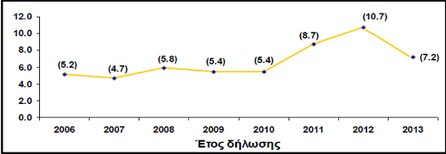 Σχήμα 1: Δηλώσεις HIV λοίμωξης ανά 100.000 πληθυσμού.