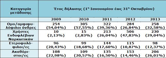 – Το πρώτο δεκάμηνο του 2013 δηλώθηκαν 792 συνολικά περιστατικά HIV σε σύγκριση με τα 1.058 περιστατικά που δηλώθηκαν το αντίστοιχο χρονικό διάστημα του 2012. Η μείωση που παρατηρείται δεν μπορεί να οδηγήσει με ασφάλεια σε συμπεράσματα (πίνακας 1).