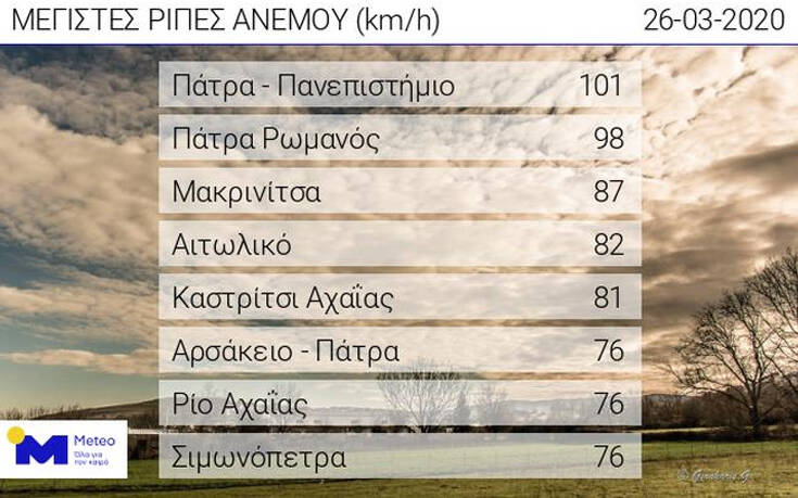 Παράλληλα, θυελλώδεις και τοπικά πολύ θυελλώδεις άνεμοι πνέουν στο Βόρειο Αιγαίο (βορειοανατολικών διευθύνσεων) και στο Ιόνιο (ανατολικών διευθύνσεων), με τις μεγαλύτερες καταγραφές του δικτύου μας να παρουσιάζονται στον παρακάτω πίνακα.