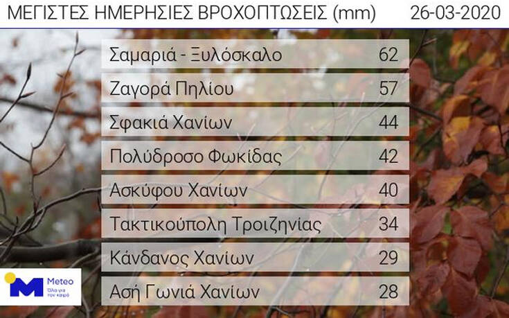 Στον πίνακα που ακολουθεί παρουσιάζονται οι 8 σταθμοί του δικτύου του Εθνικού Αστεροσκοπείου Αθηνών/meteo.gr που κατέγραψαν τα μεγαλύτερα ύψη βροχόπτωσης έως τις 09:30 το πρωί.