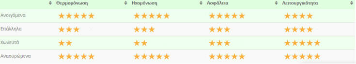Στον παρακάτω πίνακα θα δείτε παραστατικά της αποδόσεις για κάθε ένα απο τους τύπους των κουφωμάτων, Ανοιγόμενα-Επάλληλα-Χωνευτά και Ανασυρόμενα σε κάθε μία από τις κατηγορίες Θερμομόνωση-Ηχομόνωση-Ασφάλεια και Λειτουργικότητα.