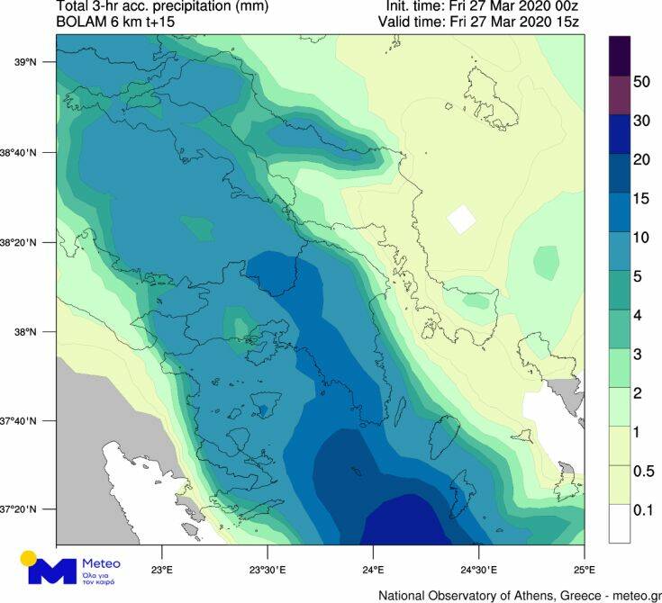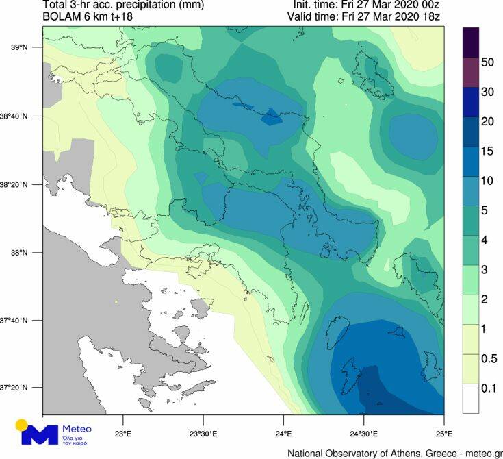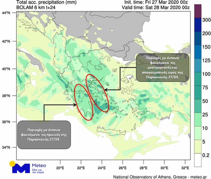 Στην παρακάτω φωτογραφία είναι το εκτιμώμενο αθροιστικό ύψος βροχής για την Παρασκευή 27/03/2020. Με κύκλους επισημαίνονται οι περιοχές όπου αναμένονται τα έντονα φαινόμενα.
