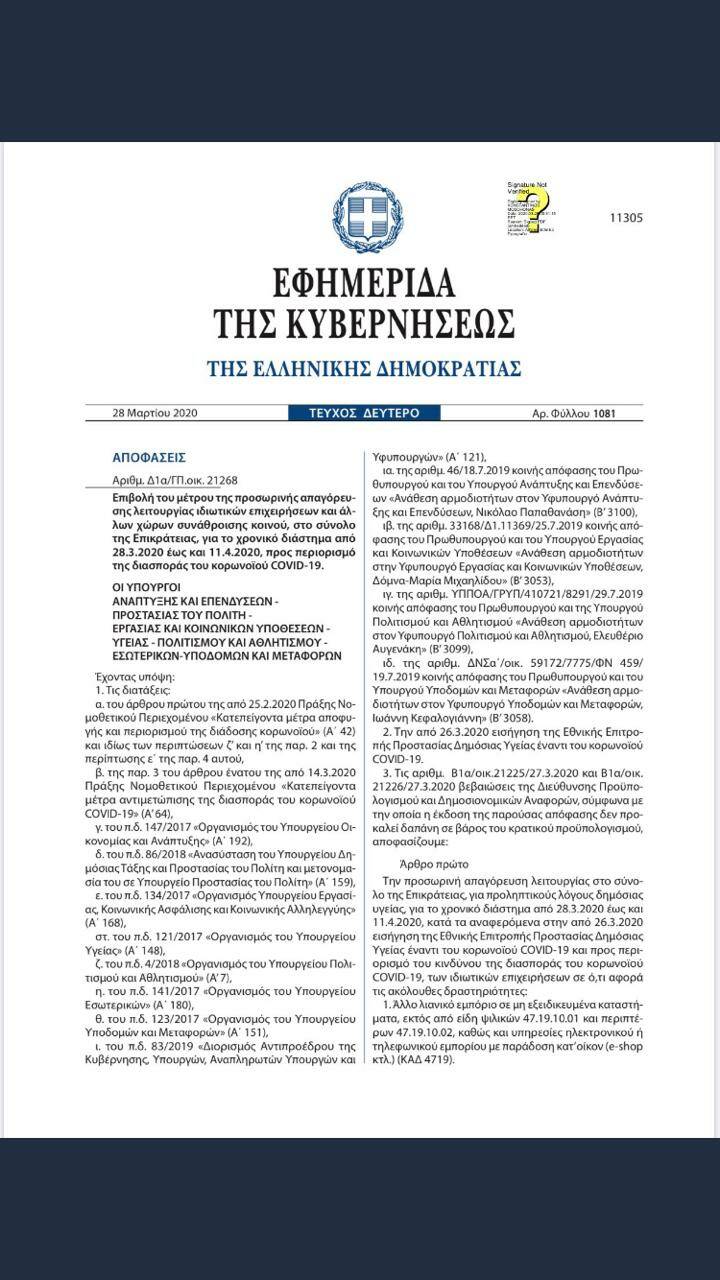 Η προηγούμενη απόφαση ήταν για το χρονικό διάστημα από 14/3/2020 έως και 27/3/2020.