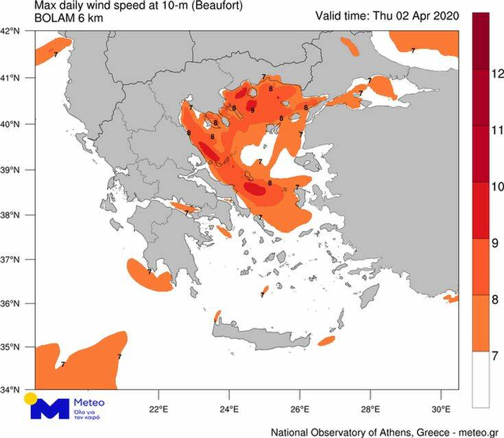 Παράλληλα, θυελλώδεις θα πνέουν οι άνεμοι στο Αιγαίο, από τις απογευματινές ώρες της Τετάρτης 01/04 στο Βόρειο Αιγαίο και κατά τη διάρκεια των πρωινών και μεσημεριανών ωρών της Πέμπτης 02/04 και στο Κεντρικό Αιγαίο, όπου η έντασή τους θα φτάνει τα 8-9 μποφόρ, όπως διακρίνεται στο Χάρτης 3.