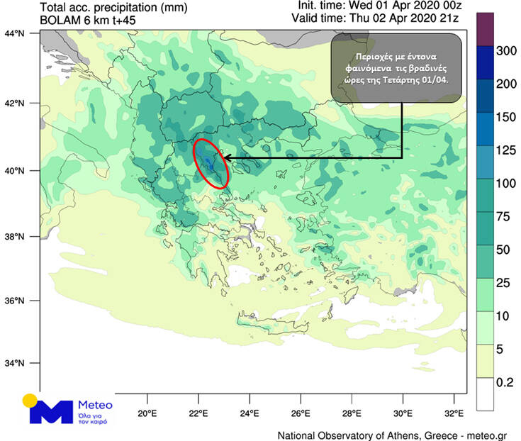 Σύμφωνα με τα διαθέσιμα προγνωστικά στοιχεία του Εθνικού Αστεροσκοπείου Αθηνών / meteo.gr, οι βροχές που εκδηλώνονται από τις πρωινές ώρες της Τετάρτης 01/04 στα δυτικά και βόρεια, κατά τη διάρκεια της ημέρας θα ενταθούν και θα επεκταθούν ανατολικά. Τοπικά έντονα φαινόμενα αναμένονται από το μεσημέρι στη Μακεδονία και το Βόρειο Αιγαίο. Κατά τη διάρκεια της νύχτας έως τις πρώτες πρωινές ώρες της Πέμπτης 02/04, τα φαινόμενα θα επηρεάσουν και τα νησιά του Ανατολικού Αιγαίου.