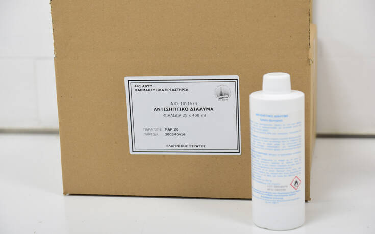 Ήδη στην 441 Αποθήκη Βάσεως Υγειονομικού Υλικού έχει ξεκινήσει η παραγωγή αντισηπτικού διαλύματος από κατασχεμένες ποσότητες αιθυλικής αλκοόλης, με αρχικό σχεδιασμό διάθεσης 20.000 φιαλών των 400 χιλιοστόλιτρων για την κάλυψη των αναγκών των Ενόπλων Δυνάμεων, 1.500 φιαλών των 400 χιλιοστόλιτρων για την κάλυψη των αναγκών του ΓΕΕΦ και 13.500 φιαλών του ενός λίτρου για το Υπουργείο Υγείας. Από τις παραχθείσες παρτίδες αντισηπτικού διαλύματος θα χορηγηθούν χίλιες φιάλες για τις ανάγκες του «Χαμόγελου του Παιδιού».