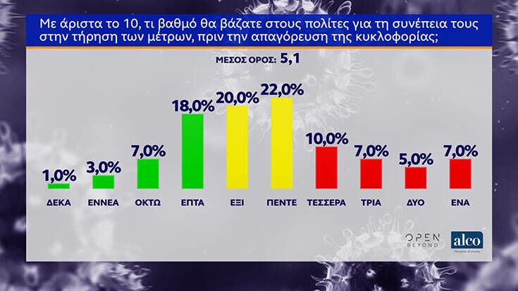 Η Alco διενήργησε δημοσκόπηση για την πανδημία για λογαριασμό του σταθμού Open, για το πώς αξιολογούν οι πολίτες την αντιμετώπιση της κρίσης από τον Κυριάκο Μητσοτάκη και την κυβέρνηση, τι λένε για τα περιοριστικά μέτρα, αλλά και το βαθμό ανταπόκρισής τους στην απαγόρευση μετακινήσεων, ποια είναι η άποψη τους για τον καθηγητή λοιμωξιολογίας Σωτήρη Τσιόδρα και πόσο ανησυχούν από την εξάπλωση του κορονοϊού.